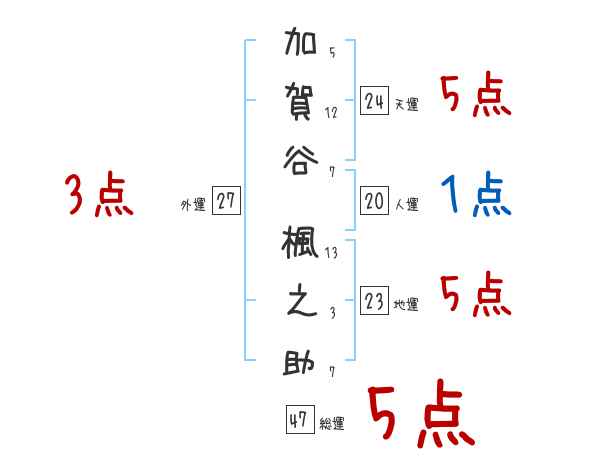 天運![]() | 加賀谷楓之助さんの天運は24画の5つ星!家庭運が良く順調な人生。金運にも恵まれる。 家系が持つ宿命的な運勢を表します。祖先から受け継いだ苗字ですので自分の力が及びません。家柄を象徴します。 |