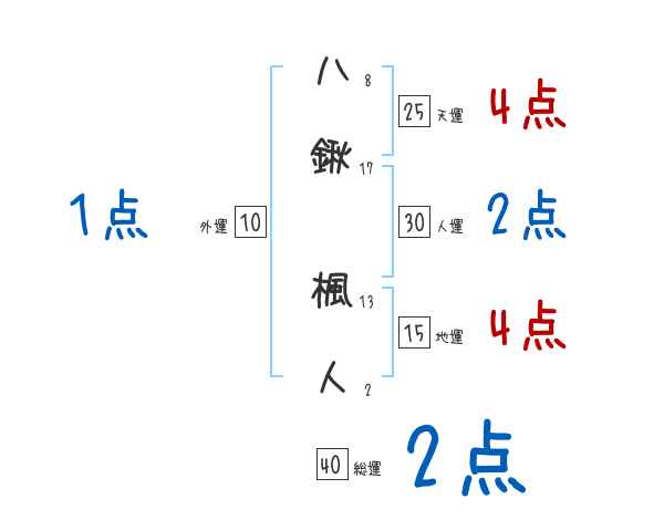 天運![]() | 八鍬楓人さんの天運は25画の4つ星!個性があり才能があふれる。強運の持ち主で発展する。 家系が持つ宿命的な運勢を表します。祖先から受け継いだ苗字ですので自分の力が及びません。家柄を象徴します。 |