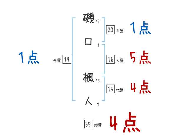 外運![]() | 磯口楓人さんの外運は19画の1つ星!優れた才能を持ちますが、協調性が足りないことも。周りの人と協力する事を意識しましょう。 生活面を象徴する運勢です。外部から受ける影響力を表し、結婚運、家庭運や職場、環境への順応性を表します。 |