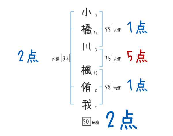 人運![]() | 小橋川楓侑我さんの人運は16画の5つ星!人望が厚く大きく発展する。逆転成功が見える。 性格や才能などを表す2番目に重要な運勢です。人間関係や協調性、社会的な成功に影響します。主に20歳から50歳ぐらいまでの中年期の運勢を表します。 |
