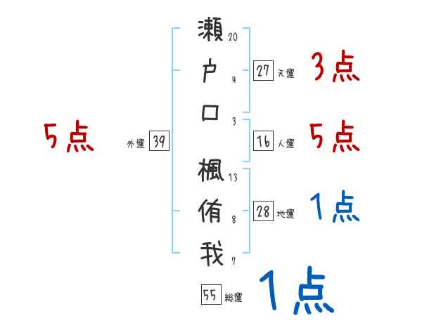 外運![]() | 瀬戸口楓侑我さんの外運は39画の5つ星!社交性に優れ人望が厚い。人の上に立ち成功する。 生活面を象徴する運勢です。外部から受ける影響力を表し、結婚運、家庭運や職場、環境への順応性を表します。 |