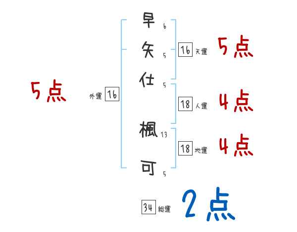 天運![]() | 早矢仕楓可さんの天運は16画の5つ星!人望が厚く大きく発展する。逆転成功が見える。 家系が持つ宿命的な運勢を表します。祖先から受け継いだ苗字ですので自分の力が及びません。家柄を象徴します。 |