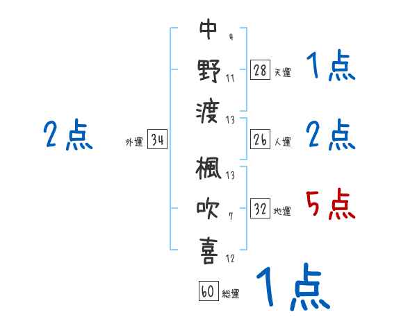 天運![]() | 中野渡楓吹喜さんの天運は28画の1つ星!家庭環境に注意。スポーツで活躍できる能力があるかも。 家系が持つ宿命的な運勢を表します。祖先から受け継いだ苗字ですので自分の力が及びません。家柄を象徴します。 |