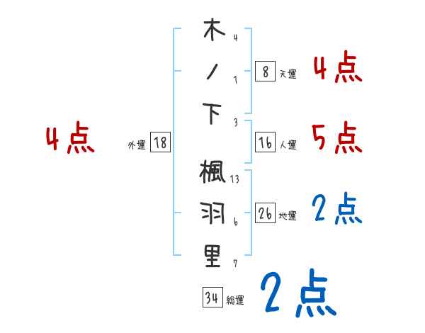 総運![]() | 木ノ下楓羽里さんの総運は34画の2つ星!独創性に優れるが、自尊心が強く災難に注意しましょう。 あなたの人生を表す1番重要な運勢です。生涯を通じて影響する総合運となり、主に50歳以降の晩年期に影響を及ぼします。 |
