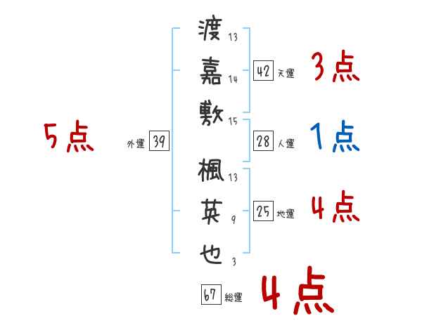 外運![]() | 渡嘉敷楓英也さんの外運は39画の5つ星!社交性に優れ人望が厚い。人の上に立ち成功する。 生活面を象徴する運勢です。外部から受ける影響力を表し、結婚運、家庭運や職場、環境への順応性を表します。 |