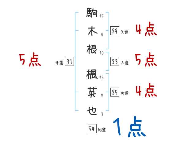 総運![]() | 駒木根楓英也さんの総運は54画の1つ星!トラブルが多いかも。周りをよく見て協調して過ごしましょう。 あなたの人生を表す1番重要な運勢です。生涯を通じて影響する総合運となり、主に50歳以降の晩年期に影響を及ぼします。 |