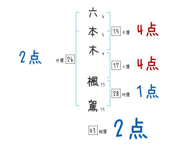 総運![]() | 六本木楓駕さんの総運は43画の2つ星!頑固な性格で独立心が強いかも。やや非現実的で浪費に注意しましょう。 あなたの人生を表す1番重要な運勢です。生涯を通じて影響する総合運となり、主に50歳以降の晩年期に影響を及ぼします。 |
