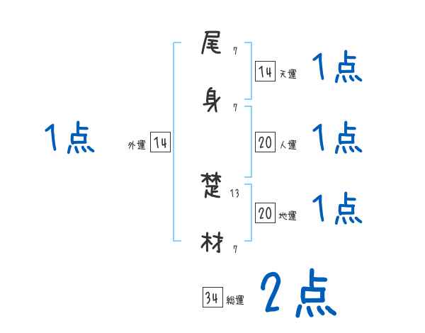 総運![]() | 尾身楚材さんの総運は34画の2つ星!独創性に優れるが、自尊心が強く災難に注意しましょう。 あなたの人生を表す1番重要な運勢です。生涯を通じて影響する総合運となり、主に50歳以降の晩年期に影響を及ぼします。 |