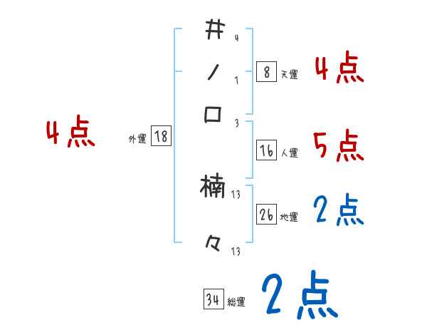 人運![]() | 井ノ口楠々さんの人運は16画の5つ星!人望が厚く大きく発展する。逆転成功が見える。 性格や才能などを表す2番目に重要な運勢です。人間関係や協調性、社会的な成功に影響します。主に20歳から50歳ぐらいまでの中年期の運勢を表します。 |