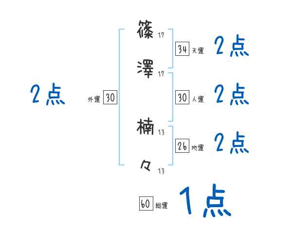 外運![]() | 篠澤楠々さんの外運は30画の2つ星!浮き沈みの激しさに注意しましょう。 生活面を象徴する運勢です。外部から受ける影響力を表し、結婚運、家庭運や職場、環境への順応性を表します。 |