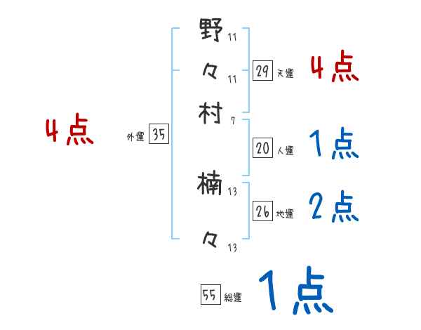 天運![]() | 野々村楠々さんの天運は29画の4つ星!完全主義で才能がある。厳格な心の持ち主。 家系が持つ宿命的な運勢を表します。祖先から受け継いだ苗字ですので自分の力が及びません。家柄を象徴します。 |