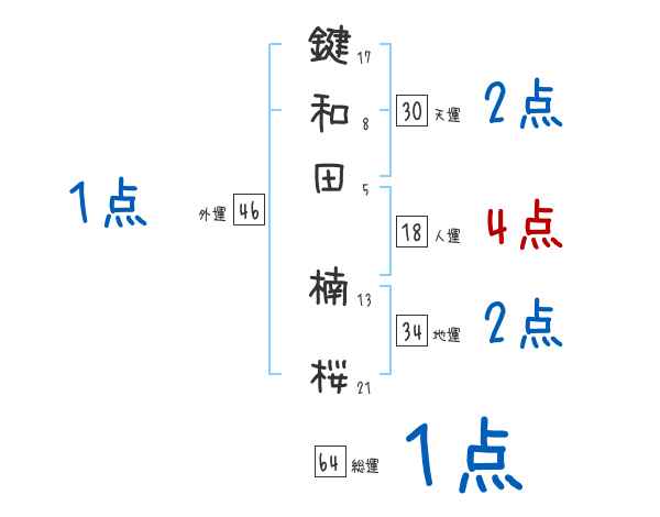 天運![]() | 鍵和田楠桜さんの天運は30画の2つ星!浮き沈みの激しさに注意しましょう。 家系が持つ宿命的な運勢を表します。祖先から受け継いだ苗字ですので自分の力が及びません。家柄を象徴します。 |