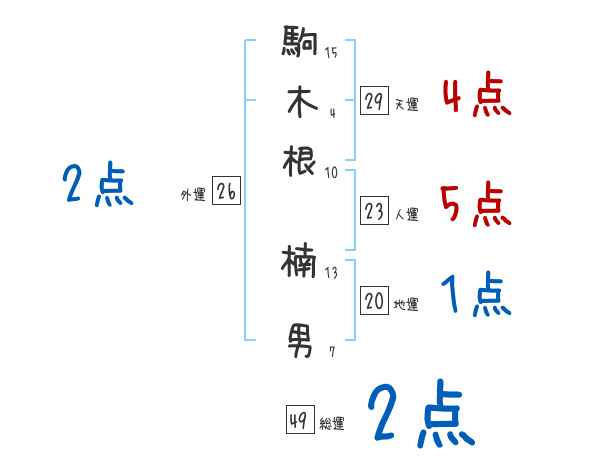 外運![]() | 駒木根楠男さんの外運は26画の2つ星!波瀾万丈かも。信頼できる人を大事にしましょう。 生活面を象徴する運勢です。外部から受ける影響力を表し、結婚運、家庭運や職場、環境への順応性を表します。 |