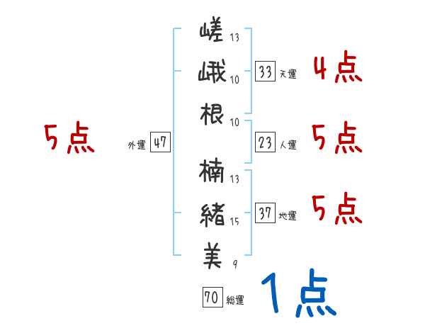 天運![]() | 嵯峨根楠緒美さんの天運は33画の4つ星!権力志向でプライドが高い。勇気があり運を切り開き成功する。 家系が持つ宿命的な運勢を表します。祖先から受け継いだ苗字ですので自分の力が及びません。家柄を象徴します。 |