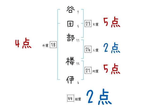 天運![]() | 谷田部楼伊さんの天運は23画の5つ星!想像力に優れ活力がある。一代で成功し名誉を手に入れる。 家系が持つ宿命的な運勢を表します。祖先から受け継いだ苗字ですので自分の力が及びません。家柄を象徴します。 |