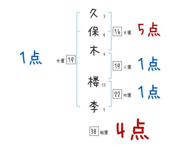 天運![]() | 久保木楼李さんの天運は16画の5つ星!人望が厚く大きく発展する。逆転成功が見える。 家系が持つ宿命的な運勢を表します。祖先から受け継いだ苗字ですので自分の力が及びません。家柄を象徴します。 |
