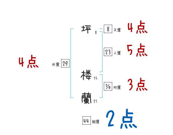 天運![]() | 坪楼蘭さんの天運は8画の4つ星!勤勉家。根気強く努力し成功する。忍耐力がある。 家系が持つ宿命的な運勢を表します。祖先から受け継いだ苗字ですので自分の力が及びません。家柄を象徴します。 |