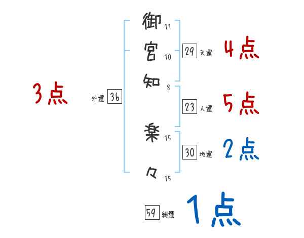 外運![]() | 御宮知楽々さんの外運は36画の3つ星!先見性が豊かです。多少神経質で苦労することも。 生活面を象徴する運勢です。外部から受ける影響力を表し、結婚運、家庭運や職場、環境への順応性を表します。 |