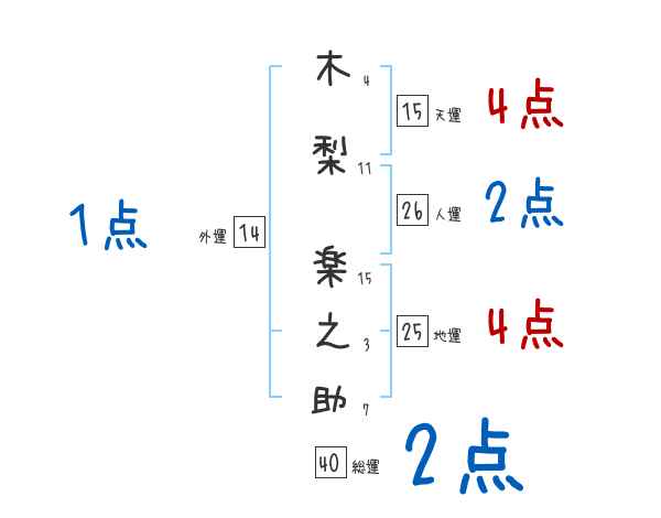外運![]() | 木梨楽之助さんの外運は14画の1つ星!人に対して優しいがストレスを溜め込みがち。人間関係のトラブルを避けるよう気をつけましょう。 生活面を象徴する運勢です。外部から受ける影響力を表し、結婚運、家庭運や職場、環境への順応性を表します。 |