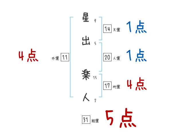 天運![]() | 星出楽人さんの天運は14画の1つ星!人に対して優しいがストレスを溜め込みがち。人間関係のトラブルを避けるよう気をつけましょう。 家系が持つ宿命的な運勢を表します。祖先から受け継いだ苗字ですので自分の力が及びません。家柄を象徴します。 |