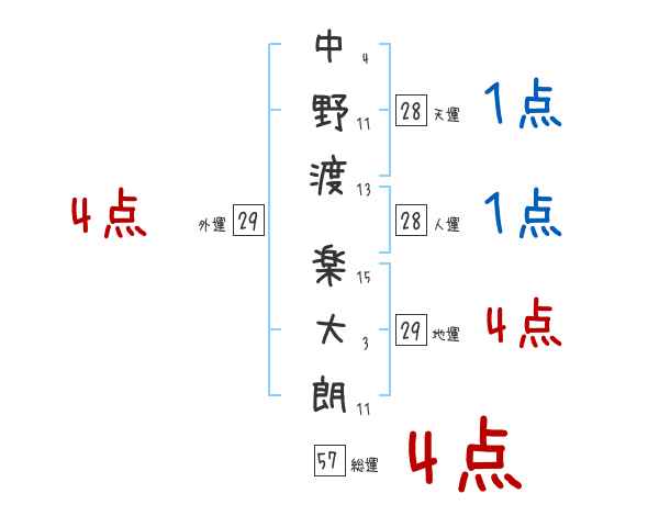 外運![]() | 中野渡楽大朗さんの外運は29画の4つ星!完全主義で才能がある。厳格な心の持ち主。 生活面を象徴する運勢です。外部から受ける影響力を表し、結婚運、家庭運や職場、環境への順応性を表します。 |