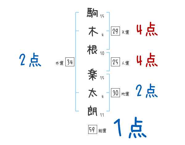 天運![]() | 駒木根楽太朗さんの天運は29画の4つ星!完全主義で才能がある。厳格な心の持ち主。 家系が持つ宿命的な運勢を表します。祖先から受け継いだ苗字ですので自分の力が及びません。家柄を象徴します。 |