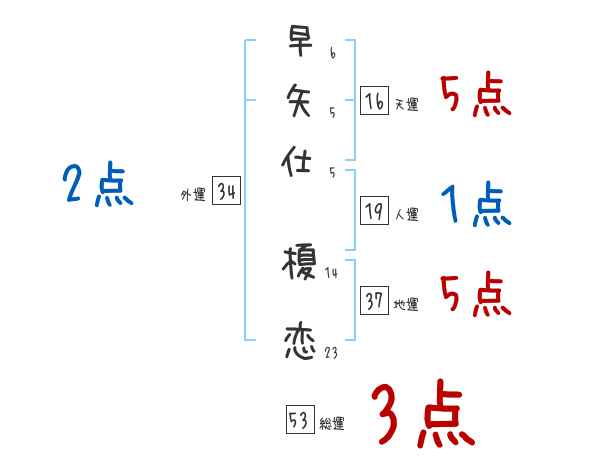 総運![]() | 早矢仕榎恋さんの総運は53画の3つ星!やや見栄っ張りで虚栄心がある。散財に注意。 あなたの人生を表す1番重要な運勢です。生涯を通じて影響する総合運となり、主に50歳以降の晩年期に影響を及ぼします。 |