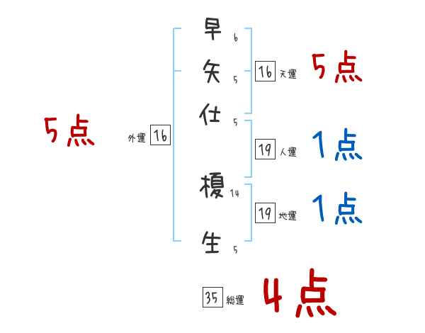 天運![]() | 早矢仕榎生さんの天運は16画の5つ星!人望が厚く大きく発展する。逆転成功が見える。 家系が持つ宿命的な運勢を表します。祖先から受け継いだ苗字ですので自分の力が及びません。家柄を象徴します。 |