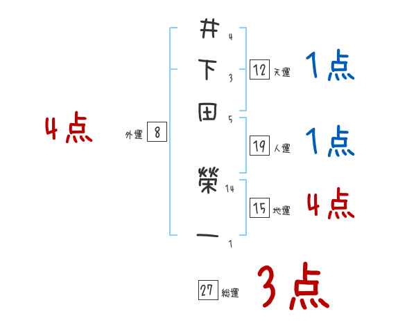 地運![]() | 井下田榮一さんの地運は15画の4つ星!人徳があり出世する。順調に物事を進め円満な人生。 個性を表す基礎的な運勢です。性格形成や対人関係、行動力など家庭環境に影響されます。主に誕生してから20歳くらいまでの若年期の運勢を表します。 |