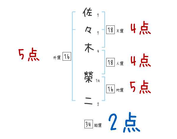 外運![]() | 佐々木榮二さんの外運は16画の5つ星!人望が厚く大きく発展する。逆転成功が見える。 生活面を象徴する運勢です。外部から受ける影響力を表し、結婚運、家庭運や職場、環境への順応性を表します。 |