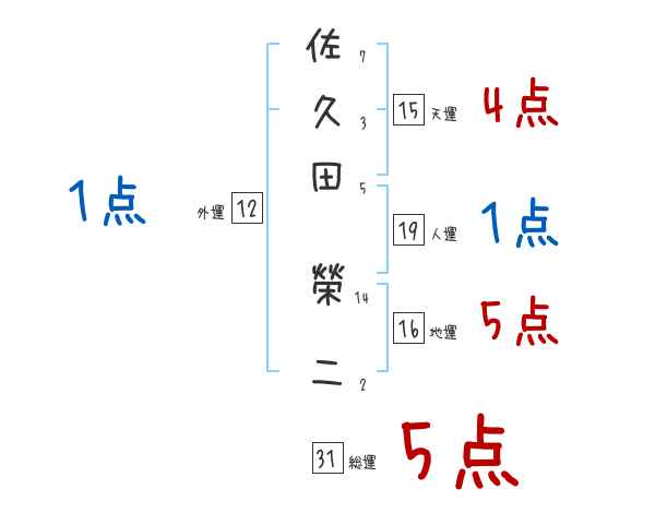| 総運  | 佐久田榮二さんの総運は31画の5つ星!社交性があり判断力に優れる。順風満帆な人生で円満な生活。あなたの人生を表す1番重要な運勢です。生涯を通じて影響する総合運となり、主に50歳以降の晩年期に影響を及ぼします。 |