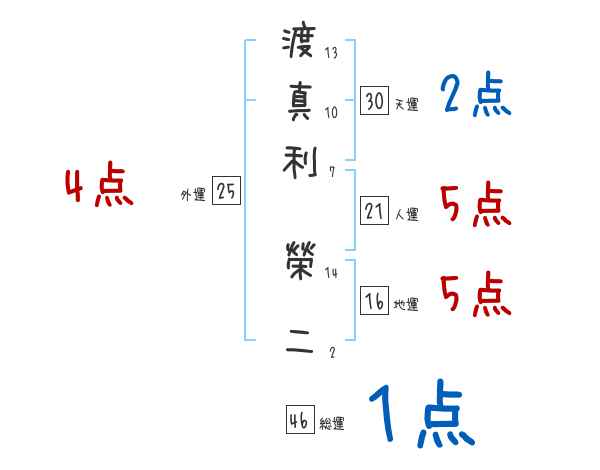 人運![]() | 渡真利榮二さんの人運は21画の5つ星!統率力がある。独立し成功する。名誉を手に入れる。 性格や才能などを表す2番目に重要な運勢です。人間関係や協調性、社会的な成功に影響します。主に20歳から50歳ぐらいまでの中年期の運勢を表します。 |