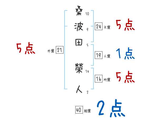 天運![]() | 桑波田榮人さんの天運は24画の5つ星!家庭運が良く順調な人生。金運にも恵まれる。 家系が持つ宿命的な運勢を表します。祖先から受け継いだ苗字ですので自分の力が及びません。家柄を象徴します。 |