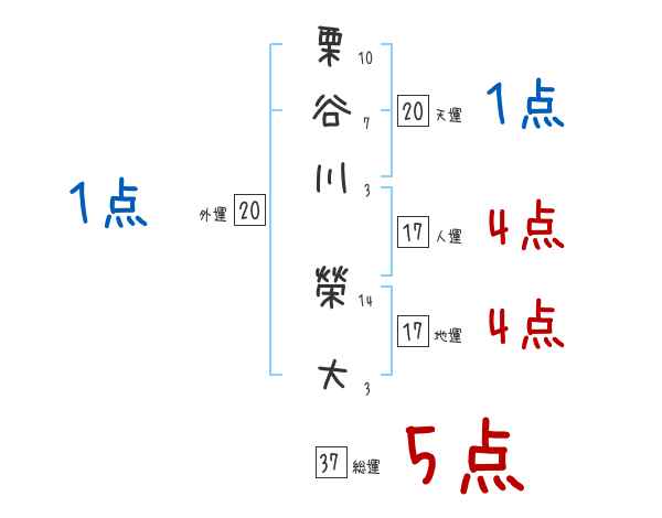 総運![]() | 栗谷川榮大さんの総運は37画の5つ星!努力家で順応性に優れる。現実的な考え方ができ忠実に物事をこなす。 あなたの人生を表す1番重要な運勢です。生涯を通じて影響する総合運となり、主に50歳以降の晩年期に影響を及ぼします。 |