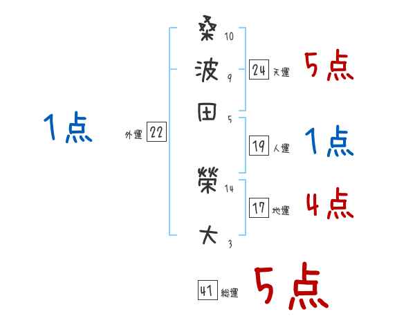 天運![]() | 桑波田榮大さんの天運は24画の5つ星!家庭運が良く順調な人生。金運にも恵まれる。 家系が持つ宿命的な運勢を表します。祖先から受け継いだ苗字ですので自分の力が及びません。家柄を象徴します。 |