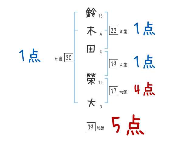 総運![]() | 鈴木田榮大さんの総運は39画の5つ星!社交性に優れ人望が厚い。人の上に立ち成功する。 あなたの人生を表す1番重要な運勢です。生涯を通じて影響する総合運となり、主に50歳以降の晩年期に影響を及ぼします。 |