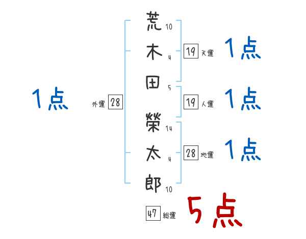 総運![]() | 荒木田榮太郎さんの総運は47画の5つ星!実力が開花し発展する円満な人生。財に恵まれる。 あなたの人生を表す1番重要な運勢です。生涯を通じて影響する総合運となり、主に50歳以降の晩年期に影響を及ぼします。 |