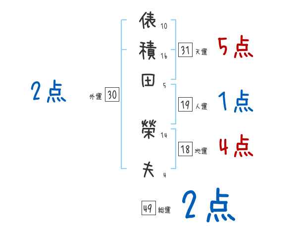 人運![]() | 俵積田榮夫さんの人運は19画の1つ星!優れた才能を持ちますが、協調性が足りないことも。周りの人と協力する事を意識しましょう。 性格や才能などを表す2番目に重要な運勢です。人間関係や協調性、社会的な成功に影響します。主に20歳から50歳ぐらいまでの中年期の運勢を表します。 |
