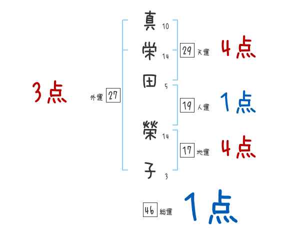 総運![]() | 真栄田榮子さんの総運は46画の1つ星!迷走することが多く苦労するかも。目先のことにとらわれないように。 あなたの人生を表す1番重要な運勢です。生涯を通じて影響する総合運となり、主に50歳以降の晩年期に影響を及ぼします。 |