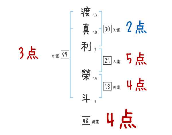 人運![]() | 渡真利榮斗さんの人運は21画の5つ星!統率力がある。独立し成功する。名誉を手に入れる。 性格や才能などを表す2番目に重要な運勢です。人間関係や協調性、社会的な成功に影響します。主に20歳から50歳ぐらいまでの中年期の運勢を表します。 |