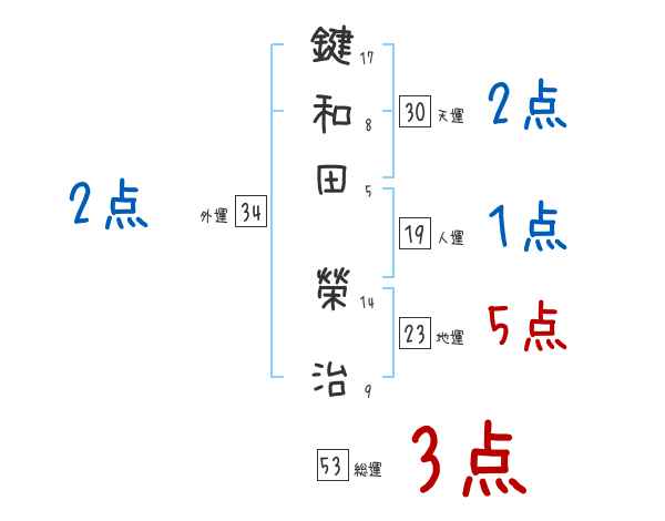 総運![]() | 鍵和田榮治さんの総運は53画の3つ星!やや見栄っ張りで虚栄心がある。散財に注意。 あなたの人生を表す1番重要な運勢です。生涯を通じて影響する総合運となり、主に50歳以降の晩年期に影響を及ぼします。 |