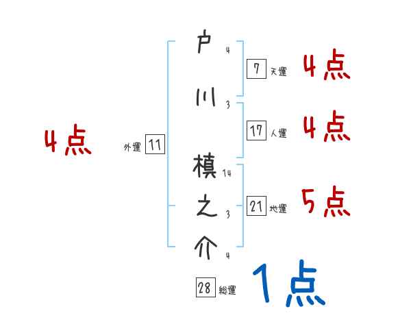 | 天運  | 戸川槙之介さんの天運は7画の4つ星!強い意志や信念を持ち独立心が強い。自立する。家系が持つ宿命的な運勢を表します。祖先から受け継いだ苗字ですので自分の力が及びません。家柄を象徴します。 |
