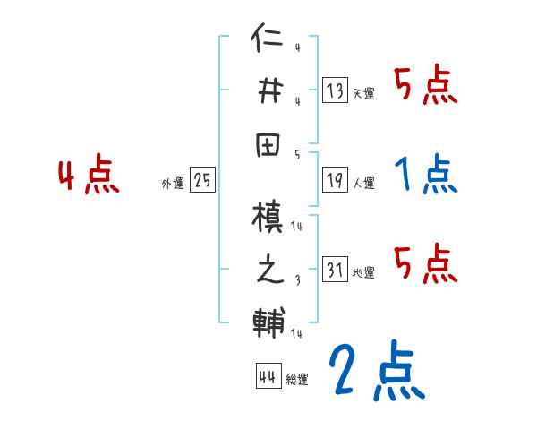 総運![]() | 仁井田槙之輔さんの総運は44画の2つ星!誠実で慎重な性格。物事を考えすぎないように注意しましょう。 あなたの人生を表す1番重要な運勢です。生涯を通じて影響する総合運となり、主に50歳以降の晩年期に影響を及ぼします。 |