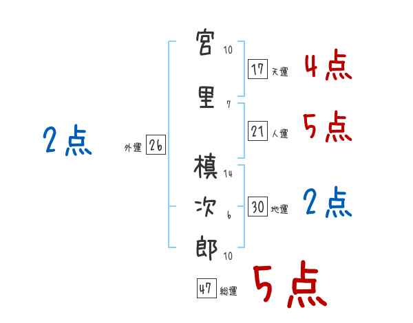 外運![]() | 宮里槙次郎さんの外運は26画の2つ星!波瀾万丈かも。信頼できる人を大事にしましょう。 生活面を象徴する運勢です。外部から受ける影響力を表し、結婚運、家庭運や職場、環境への順応性を表します。 |