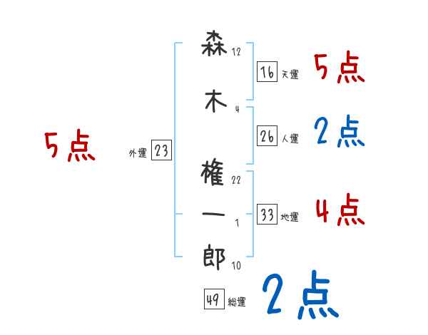 天運![]() | 森木権一郎さんの天運は16画の5つ星!人望が厚く大きく発展する。逆転成功が見える。 家系が持つ宿命的な運勢を表します。祖先から受け継いだ苗字ですので自分の力が及びません。家柄を象徴します。 |