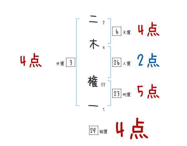 天運![]() | 二木権一さんの天運は6画の4つ星!慎重な努力家で信頼を得る。誠実な精神で向上心に優れる。 家系が持つ宿命的な運勢を表します。祖先から受け継いだ苗字ですので自分の力が及びません。家柄を象徴します。 |