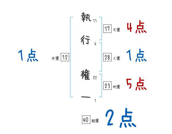 総運![]() | 執行権一さんの総運は40画の2つ星!自信過剰で物事に固執するためトラブルに注意。 あなたの人生を表す1番重要な運勢です。生涯を通じて影響する総合運となり、主に50歳以降の晩年期に影響を及ぼします。 |