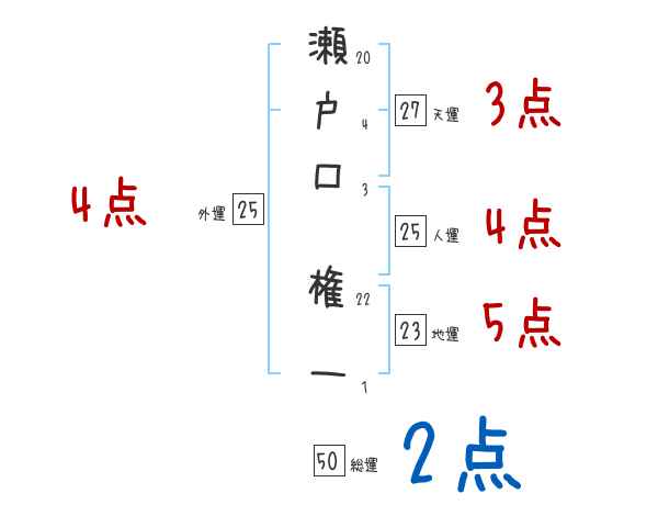 総運![]() | 瀬戸口権一さんの総運は50画の2つ星!浮き沈みが激しく不安定。しりすぼみに衰退しやすいので注意しましょう。 あなたの人生を表す1番重要な運勢です。生涯を通じて影響する総合運となり、主に50歳以降の晩年期に影響を及ぼします。 |