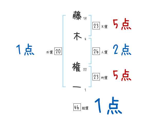 天運![]() | 藤木権一さんの天運は23画の5つ星!想像力に優れ活力がある。一代で成功し名誉を手に入れる。 家系が持つ宿命的な運勢を表します。祖先から受け継いだ苗字ですので自分の力が及びません。家柄を象徴します。 |