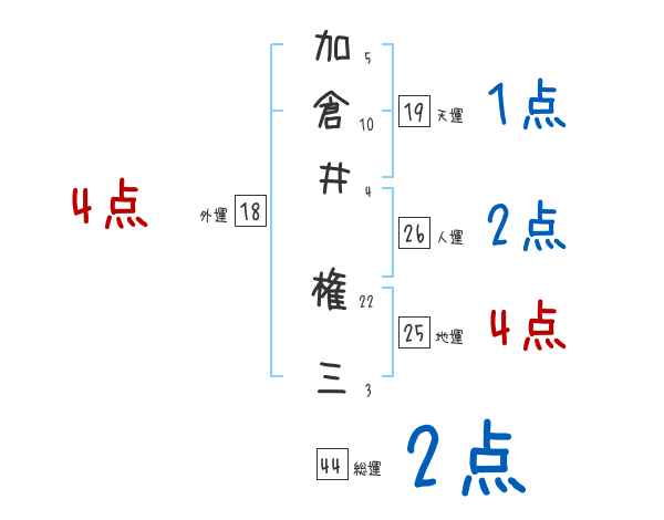 総運![]() | 加倉井権三さんの総運は44画の2つ星!誠実で慎重な性格。物事を考えすぎないように注意しましょう。 あなたの人生を表す1番重要な運勢です。生涯を通じて影響する総合運となり、主に50歳以降の晩年期に影響を及ぼします。 |